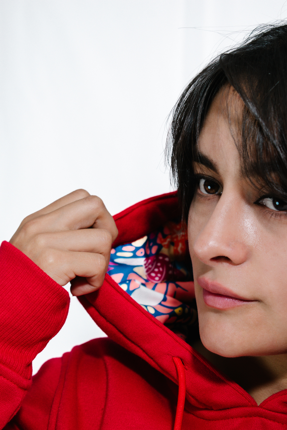 Su capota forrada con tela tejido de punto y tacto de segunda piel que añade un toque original que rompe con lo convencional y eleva cualquier outfit.